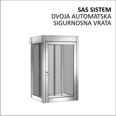 SAS - Sistem dvoja Automarska Sigurnosna vrata. Prethodno pomenuto iskustvo, a i cinjenica da godinama unazad reprezentujemo jednu od najrenomiranijih kompanija u svetu, "brand name" belgijsku kompaniju Automatic Systems, a koja u svojoj ponudi ima SAS VRATA kao gotov proizvod, resili smo da isti razvijemo i kao potpuno nas proizvod, sa idejom da pre svega bude daleko jeftiniji i daleko fleksibilniji. Verujemo da to nismo lose uradili, a flrksibilnost obezbedjue to, da ista radimo po principu i "na meru". Odnosno, uocili smo da se sigurnosna vrata, ne retko rade i na postojecim objektima (recimo filijalama banaka), a koji vec imaju jedna vrata i da je najekonomicnije, jednostavno samo dodati druga vrata, zatim nasu automatiku i software i integrisalii sve u sistem da funkconise identicno kao gotovi proizvodi "brand name" kompanija. I jasno, to smo prvo uradili na vratima naseg preduzeca, nize vise detalja, kao i fotografije postavljenog sistema na vratima naseg preduzeca. Isticemo posebno cinjenicu fleksibilnost, sto znaci da nas Kupac nema obavezu da se "uklapa" u postojecu funkcionalnost i procedure, sto jeste slucaj kod "brand name" proizvoda, vec jednstavno moze od nas da trazi da funkcionalnost, odnosno procedura bude bas onakva kakva njemu odgovara. Recimo menja automatske glasovne poruke kako njemu odgovaraju, menja sekvence, vremena, procduru, dodaje i VIP RFID sistem prolaska itd.